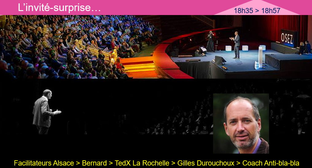 Après Viviane, place au second invité-surprise, Gilles Durouchoux que Bernard a connu lors du TedX de La Rochelle. Gille se définit comme Conférencier anti blabla,et, rien que pour ça, Bernard et David lui ont proposé de venir présenter son activité en espérant qu’elle intriguera et intéresserai les participants.